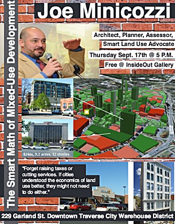 Joe Minicozzi, Architect, Planner, Assessor, Smart Land Use Advocate, will speak in Traverse City, MI, Thursday, 9/17, 5pm at InsideOut Gallery, 229 Garland St.
